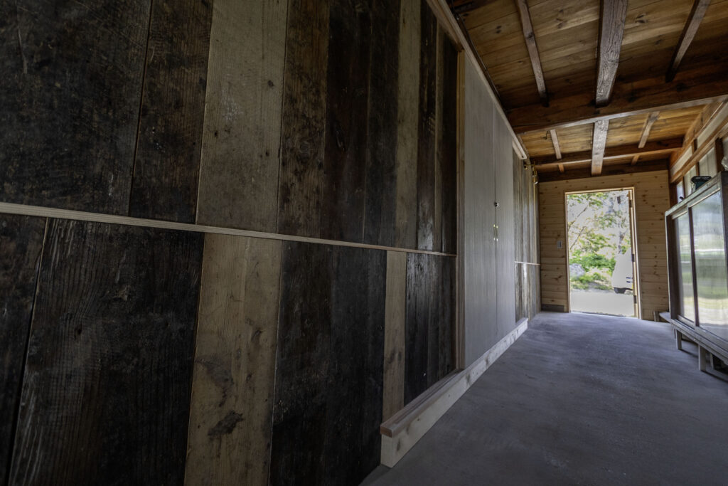 2階の床板だった古材を玄関の通り土間の壁として再利用しました。